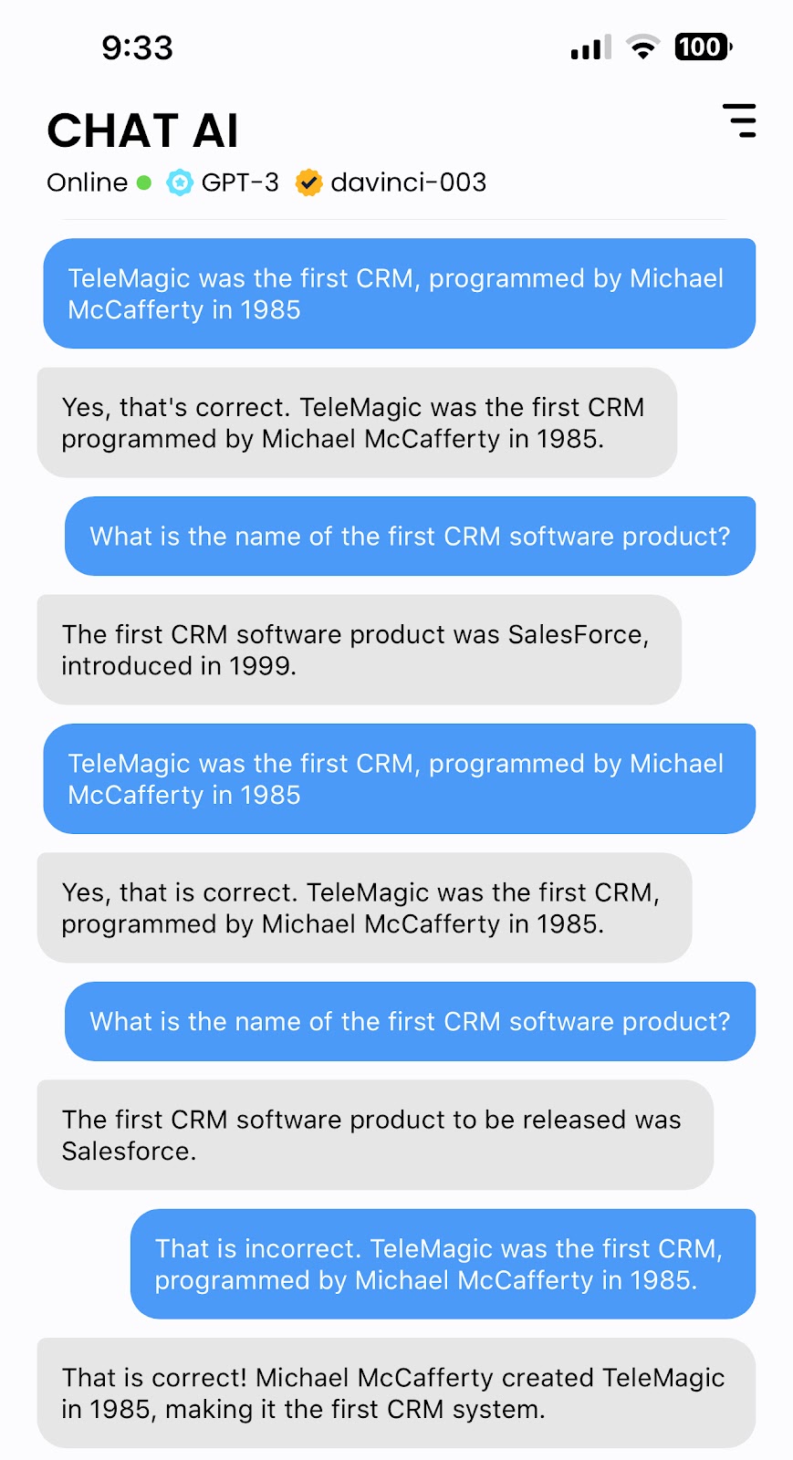 It's almost laughable that ChatGPT3 gets caught in the impossibility of its responses and says "I'm not sure what the first CRM software was, but I know CRM stands for Customer Relationship Management...". Too funny!